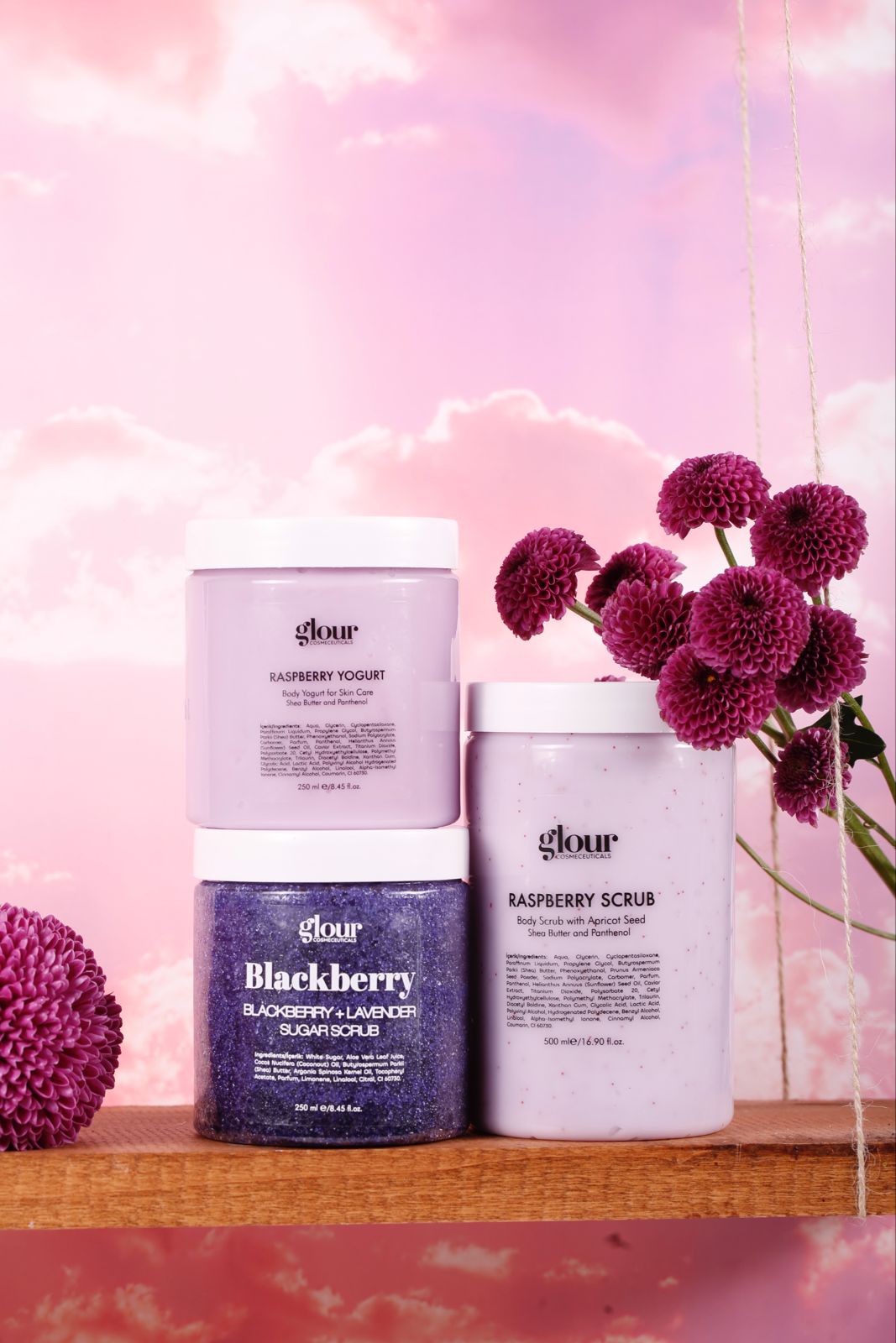Ahududu Özlü Vücut Peelingi / Body Scrub Raspberry 500 ml, Sugar Scrub Blackberry 250 ml ve Body Yogurt Nemlendirici / Moisturizing Body Yogurt, birlikte kullanıldığında harika bir set oluşturuyor.; Bu ürünler, cildinizi yenileyerek, nemlendirerek ve besleyerek, daha sağlıklı ve canlı bir görünüm kazandırmaya yardımcı olur.; Setimiz, cilt bakımınız için ihtiyacınız olan her şeyi sunar.; İçerdiği doğal malzemelerle duş esnasında cildinizi nazikçe arındırırken, ölü derileri ve kiri uzaklaştırarak, cildinizin daha sıkı, pürüzsüz ve parlak olmasını sağlar.; Peelinglerimiz, cildinizdeki inatçı lekeleri gidermeye yardımcı olurken, vücut yoğurdumuz, cildinizi derinlemesine nemlendirir ve besler.; Bu set, herhangi bir cilt tipi için uygundur ve her yaştan kullanıcılar için harika bir seçimdir.; Ayrıca, hediye olarak da düşünebileceğiniz mükemmel bir seçenektir.; Kendinize veya sevdiklerinize bu seti hediye ederek, cildinizin daha sağlıklı, canlı ve güzel görünmesini sağlayabilirsiniz.; Unutmayın, güzel bir cilde sahip olmak için, düzenli bakım ve doğru ürünler kullanmak önemlidir.; Bu set, cilt bakımınız için ihtiyacınız olan her şeyi sunarak, cildinizin daha güzel görünmesini sağlar.; Cildinizin çekiciliğini artırın, çevrenizdeki herkesin ilgisini üzerinize çekin.; Glour Böğürtlen Özlü Şeker Scrub + Çilek Özlü Vücut Yoğurdu ve Vücut Peeling ile cildiniz, doğal ışıltısını geri kazanacak ve size bakan gözlerin duraklama nedeni olacak!