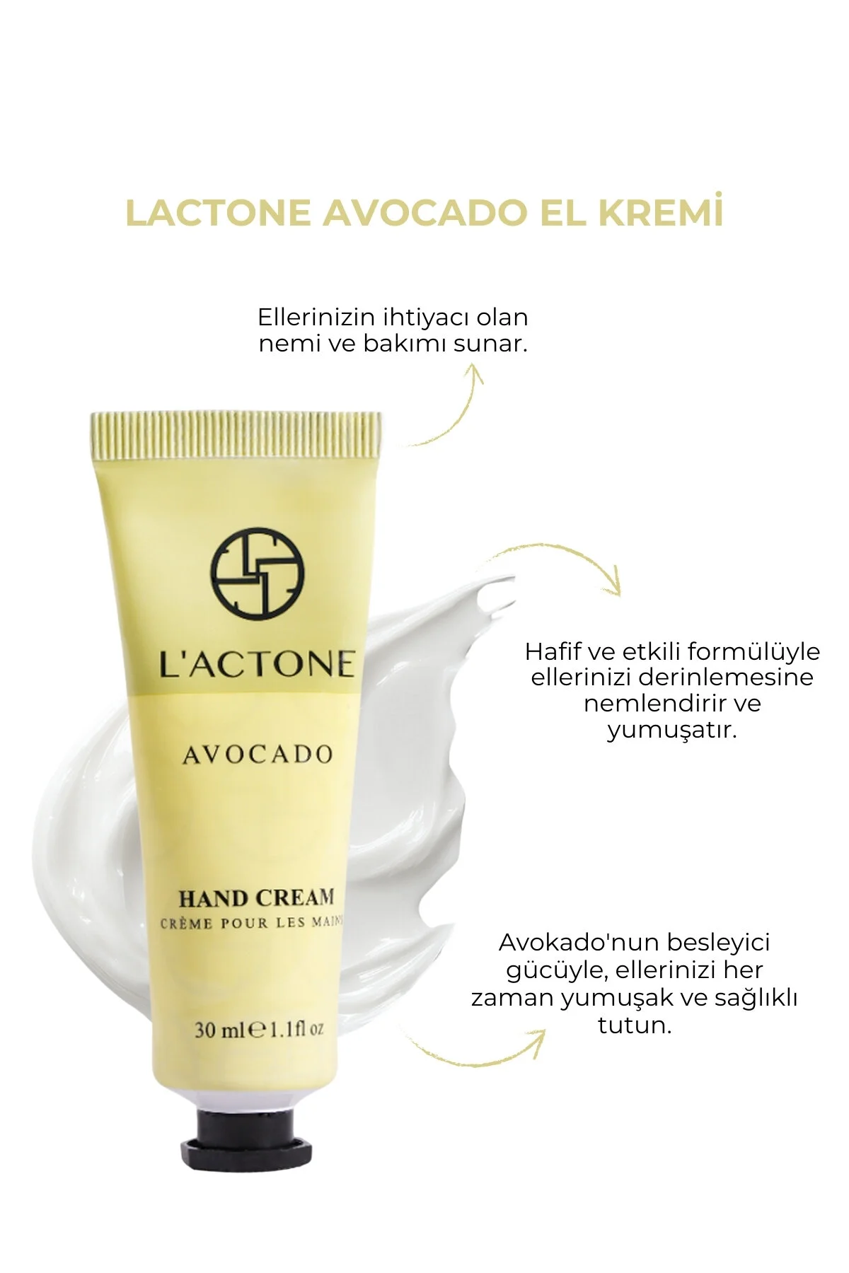 LACTONE Avocado El Kremi 30 ml Cildinize doğal bir bakım sunan LACTONE Avocado El Kremi, 30 ml’lik pratik boyutuyla her an yanınızda! Zengin avokado özleri ile formüle edilmiş bu kremin içeriği, ellerinizi besleyerek yoğun bir nemlendirme sağlar ve yumuşaklık kazandırır; ; Avokadonun doğal besin maddeleri, cildinizi derinlemesine beslerken, ona sağlıklı bir ışıltı kazandırır; ; Ürün Özellikleri:; Yoğun Nemlendirme: Kuruyan ve çatlayan ellere karşı etkili bir koruma sağlar, cildin nem dengesini geri kazandırır; ;; Hızla Emilim: Yağlı bir his bırakmadan hızlıca emilen formülü, günlük yaşamınıza pratik bir dokunuş katar; ;; Besleyici İçerik: Avokado özü, vitamin ve minerallerle dolu yapısıyla cildinizi besler ve onarıcı etki sağlar; ;; Kompakt Tasarım: 30 ml’lik boyutu, çantanızda veya ofis masanızda kolayca taşıyabilmeniz için idealdir; ; Neden LACTONE Avocado El Kremi?; Doğal ve Hafif Koku: Ferahlatıcı ve doğal aroması, el bakım rutininizi keyifli bir hale getirir; ;; Hassas Ciltler İçin Uygun: Tüm cilt tiplerine uygun, alerjik reaksiyon riskini minimuma indiren formül; ;; Günlük Kullanıma Uygun: Her gün düzenli olarak kullanabileceğiniz, cildinizi koruyacak ve besleyecek ideal bir el kremi; ; LACTONE Avocado El Kremi, ellerinizi korurken onlara yoğun bir bakım sunar; ; Her kullanımdan sonra yumuşacık ve pürüzsüz ellere sahip olmanın tadını çıkarın; ; Kendinize veya sevdiklerinize harika bir hediye seçeneği olarak bu kremi tercih edin!