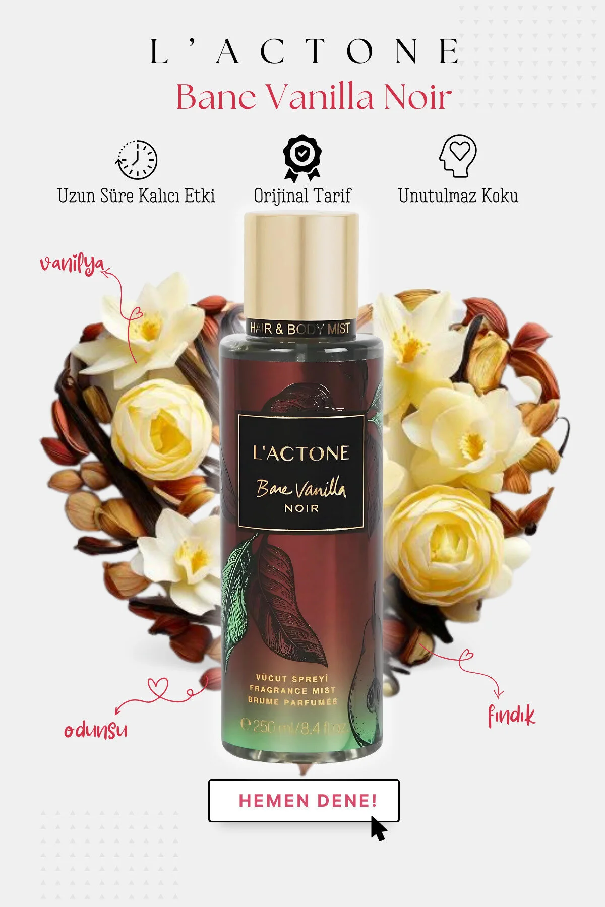 Gizemli ve Cezbedici Bir Koku İçin: Bane Vanilla Noir Body & Hair Mist 250 ml / Vücut & Saç Spreyi, vanilyanın sıcak ve çekici kokusuyla sizi sarar.; Bu sofistike vücut spreyi, derin ve zengin vanilya notalarının siyah orkide ve amber ile harmanlanması sonucu ortaya çıkan büyüleyici bir koku sunar.; Hem gündüz hem de gece kullanımı için mükemmel bir tercih olan Vanilla Noir, cildinizde kalıcı bir iz bırakır ve etkileyici bir hava yaratır.; Ürün Özellikleri: Koku Profili: Başlangıç Notaları:Vanilla Noir, sizi ilk olarak tatlı ve sıcak vanilya notalarıyla karşılar.; Bu başlangıç, cildinizde rahatlatıcı ve davetkar bir his bırakır.; ; Orta Notalar:Zamanla siyah orkidenin zengin ve egzotik notaları öne çıkar.; Bu çiçeksi dokunuş, kokunun derinliğini artırır ve onu sofistike hale getirir.; ; Alt Notalar:Amber ve hafif odunsu notalar, kokunun temelini oluşturarak cildinizde kalıcı bir sıcaklık ve çekicilik bırakır.; ; Miktar:250 ML.; Bu geniş hacimli şişe, uzun süreli kullanım sunar ve sık kullanım için idealdir.; Formül:Hafif ve hızla emilen formülü sayesinde cildinizde yapışkan bir his bırakmaz.; Rahatlıkla uygulayabilir ve gün boyu cildinizin güzel kokmasını sağlayabilirsiniz.; Kullanım Alanı:Vücudun her bölgesinde kullanılabilir.; Günlük kullanım için mükemmel olduğu gibi, özel günler ve geceler için de idealdir.; Avantajlar: Cezbedici ve Kalıcı Koku:Vanilla Noir, derin vanilya notaları ve egzotik çiçeksi dokunuşlarıyla gün boyu sizi saran kalıcı bir koku sunar.; Bu etkileyici koku, girdiğiniz her ortamda fark edilmenizi sağlar.; ; Kolay ve Pratik Kullanım:Sprey formu, ürünün eşit bir şekilde uygulanmasını sağlar.; Tek bir püskürtme ile cildinizde uzun süreli ve etkileyici bir koku bırakır.; ; Cilt Dostu Formül:Hafif ve nazik formülü, cildinizde yumuşak bir his bırakır ve gün boyu tazelik sağlar.; Hassas ciltler için de uygundur.; ; Gün Boyu Ferahlık:250 ML’lik büyük hacmi sayesinde, bu vücut spreyi uzun süre dayanır ve gün boyu ferahlık sunar.; ; Nasıl Kullanılır? Şişeyi İyice Çalkalayın:Ürünü kullanmadan önce şişeyi iyice çalkalayın.; ; Püskürtme:Vücut spreyi şişesini yaklaşık 15-20 cm mesafeden cildinize püskürtün.; Tüm vücudunuza eşit bir şekilde uygulayın.; ; Cildin Kurumasını Bekleyin:Uygulama sonrası cildinizin kurumasını bekleyin.; ; Bane Vanilla Noir Body Spray 250 MLile cildinize sofistike ve çekici bir koku kazandırın.; Şimdi sepetinize ekleyin ve her an etkileyici bir iz bırakın!