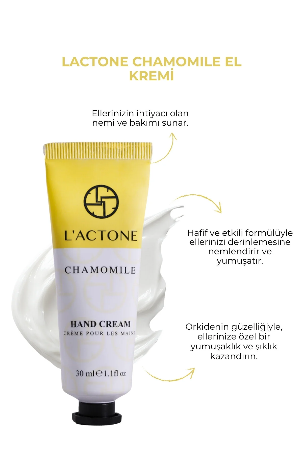LACTONE Chamomile El Kremi 30 ml Cildinizin doğal güzelliğini ön plana çıkarmak için özel olarak formüle edilmiş LACTONE Chamomile El Kremi, 30 ml’lik pratik ambalajıyla her an yanınızda! Papatya özü ile zenginleştirilmiş bu el kremi, yumuşak ve pürüzsüz eller için ideal bir seçenektir; ; Ürün Özellikleri:; Nazik ve Etkili Nemlendirme: Papatya özleri, cildinizi derinlemesine beslerken, nem dengesini sağlamak için ihtiyaç duyduğunuz nemi sunar; ;; Hızlı Emilim: Yağlı bir his bırakmadan hızla emilen formülü, günlük hayatta pratiklik sağlar; ;; Hassas Ciltler İçin Uygun: Doğal içeriklere sahip olan bu krem, hassas ciltlerde bile güvenle kullanılabilir; ;; Ferahlık Hissi: İçeriğindeki papatya, cildinizi yatıştırırken, hoş bir ferahlık hissi yaratır; ; Neden LACTONE Chamomile El Kremi?; Doğal İçerik: Papatya özü ile zenginleştirilmiş formülü, cildinizi besler ve onarıcı etki sağlar; ;; Kompakt Tasarım: 30 ml’lik boyutu, çantanızda, ofis masanızda veya seyahatlerinizde rahatça taşıyabilirsiniz; ;; Hediye Seçeneği: Sevdiklerinize veya kendinize özel bir hediye olarak tercih edebileceğiniz şık ve kullanışlı bir ürün; ; **LACTONE Chamomile El Kremi**, ellerinizi nemlendirirken cildinizdeki doğal ışıltıyı ortaya çıkarır; ; Her kullanımdan sonra yumuşak ve hoş kokulu ellere sahip olmanın keyfini çıkarın! Cildinize hak ettiği özeni gösterin ve LACTONE ile güzellik rutininizi tamamlayın.