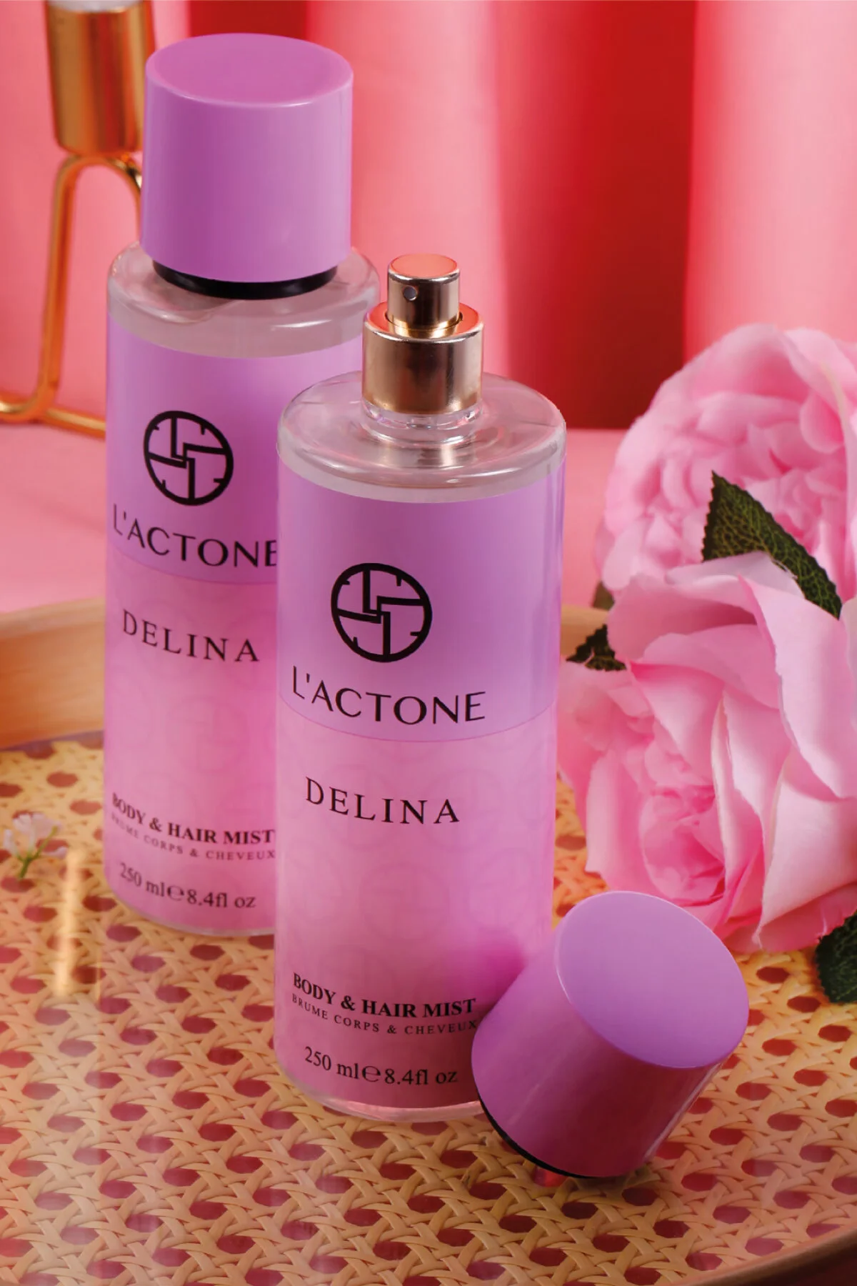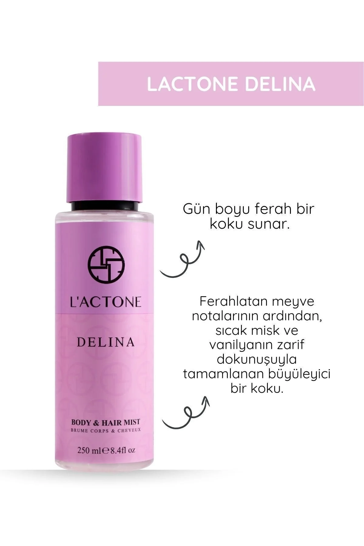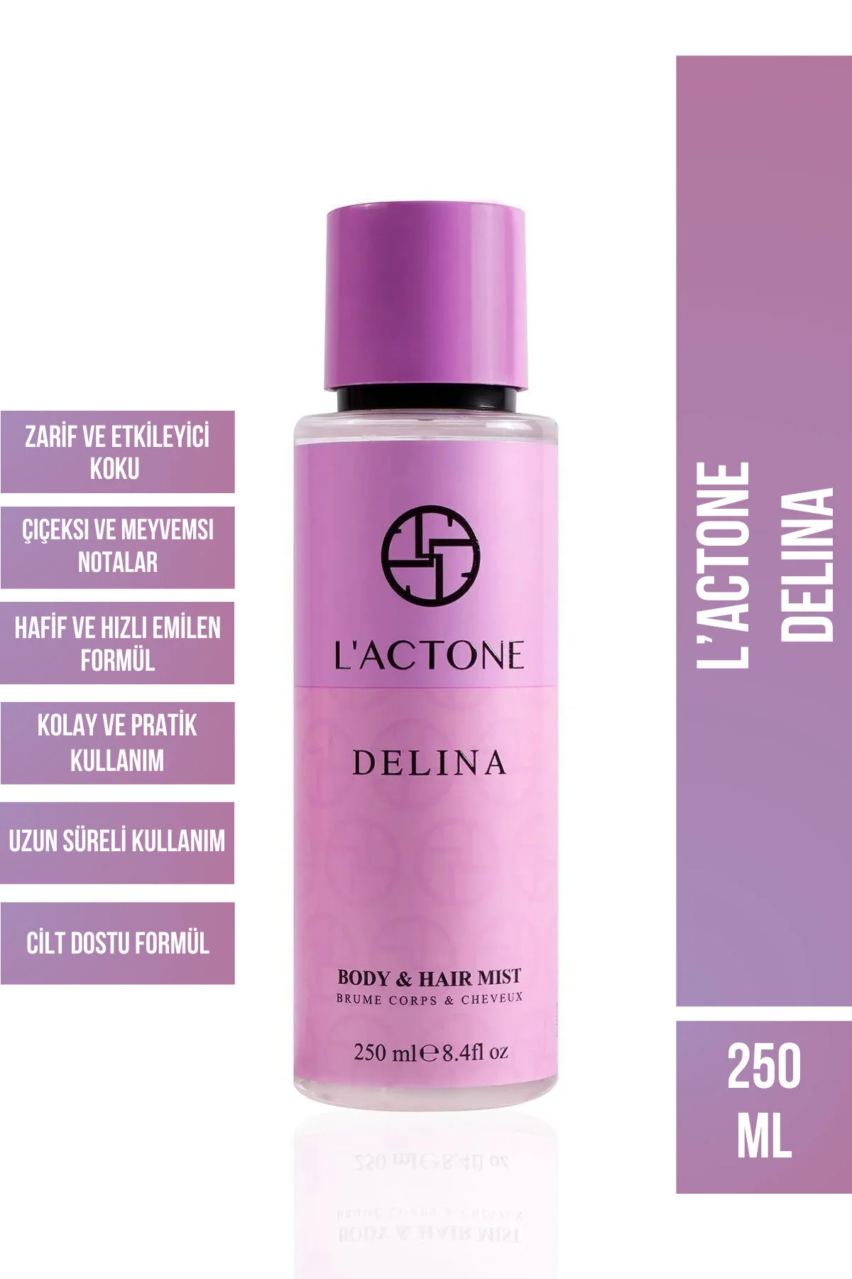 Gün boyu ferah ve etkileyici bir parfüm etkisi için ideal seçim! L'actone Delina Body & Hair Mist 250 ml / Vücut & Saç Spreyi, deniz esintileri ve çiçeksi notaların mükemmel birleşimiyle cildinize zarif ve taze bir koku kazandırır.; Hem dinlendirici hem de enerjik bir hava yaratır.; Ürün Özellikleri: Koku Profili: Delina vücut spreyi, deniz kokusu ve çiçeksi notaların harmanlanmasından oluşan taze ve hafif bir parfüm sunar.; Bu koku, deniz esintisi ve çiçeklerin ferahlığını cildinize taşır, gün boyunca sizi taze tutar.; ; Miktar:250 ML.; Büyük hacmi sayesinde uzun süreli kullanım sağlar ve vücudunuzu gün boyunca taze ve hoş bir şekilde kokutabilir.; ; Formül: Hafif ve hızlı emilen formül.; Cildinizde yapışkanlık hissi bırakmadan hızla emilir ve rahatlıkla kullanabilirsiniz.; ; Kullanım Alanı:Vücudun her bölgesinde kullanılabilir.; Günlük kullanım için idealdir ve özel günlerde ya da spor sonrası taze bir dokunuş sağlar.; ; Avantajlar: Ferahlık ve Canlılık:Pinky Shell’in deniz esintisi ve çiçeksi notaları, size her gün ferah ve enerjik bir parfüm etkisi sağlar.; Taze ve hafif kokusu gün boyunca rahatlık ve canlılık sunar.; ; Uzun Süreli Kullanım:250 mL’lik geniş hacmi, sık kullanım için uygundur ve uzun süre dayanır.; Evde ve çantanızda rahatlıkla taşınabilir.; ; Kolay ve Pratik Kullanım:Sprey formu sayesinde ürünün eşit bir şekilde uygulanmasını sağlar.; Cildinize hafifçe püskürtmeniz yeterlidir; kullanımı oldukça kolaydır.; ; Cilt Dostu Formül:Cildinize zarar vermeyen, hafif ve nazik bir formül içerir.; Cildinizde konforlu bir his bırakır.; ; Nasıl Kullanılır? Şişeyi iyice çalkalayın.; ; Ürünü yaklaşık 15-20 cm mesafeden cildinize püskürtün.; ; Uygulama sonrası cildinizin kurumasını bekleyin.
