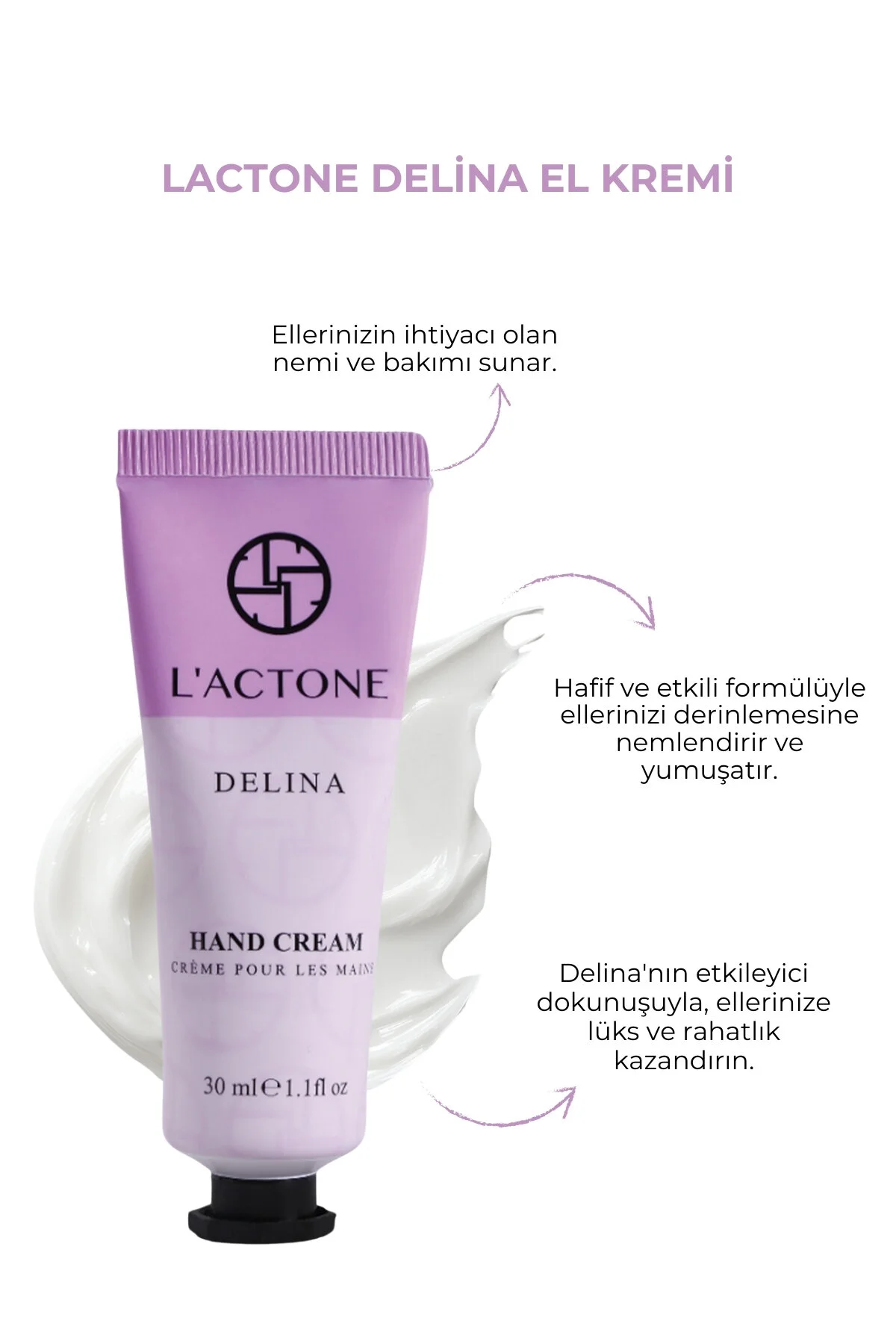 Delina çiçeklerinin büyüleyici ve zarif kokusu cildinizi yumuşatarak sizi baharın renkli ve keyifli anlarına taşıyor; Her kullanımda sanki elleriniz taze Delina çiçeklerine sarılmış gibi hissedersiniz; Lactone'un özel formülü cildinizi derinlemesine nemlendirip besler, her uygulamada ipeksi pürüzsüz bir dokunuş bırakır; Delina'nın sembolik anlamı olan aşk ve zarafet, Lactone Delina El Kremi ile günlük yaşamınıza taşınıyor; Şimdi bu özel kremin büyüsünü ellerinizde yaşayın ve Delina çiçeklerinin romantik zarafetini gün boyu yanınızda taşıyın.