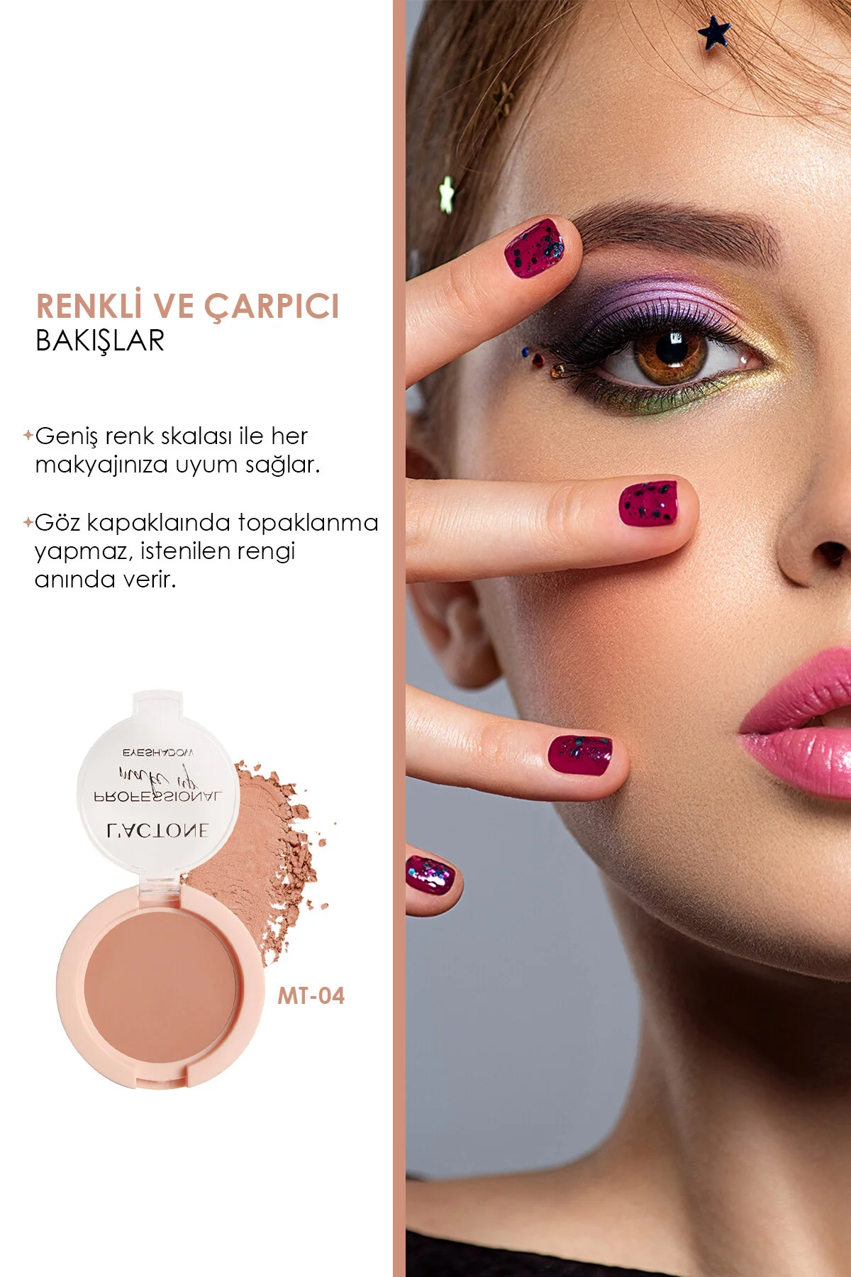 Toz formu sayesinde kolay uygulama ve eşit dağılım sağlar, göz makyajınızda profesyonel bir görünüm elde etmenize yardımcı olur; Mat bitişi ile sofistike ve modern bir stil yaratır, gün boyu kalıcı renkler sunar;