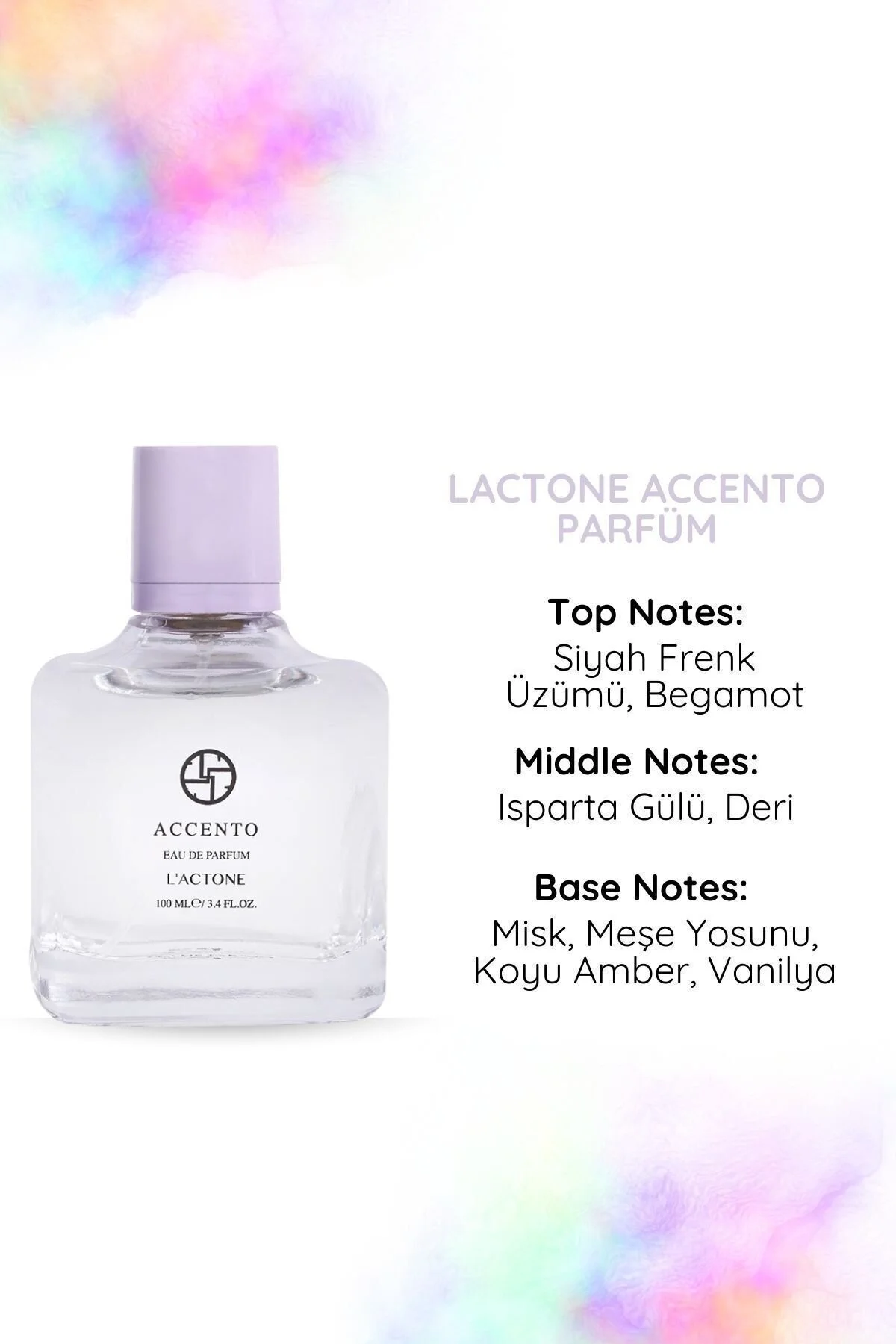 L'actone 100ml parfüm accento, zarif ve etkileyici bir koku profili sunar.; Üst notalarında siyah frenk üzümü ve bergamot, ferah ve meyvemsi bir başlangıç sağlar.; Orta notalarda ısparta gülü ve deri, parfüme sofistike ve lüks bir derinlik katar.; Alt notalarda misk, meşe yosunu, koyu amber ve vanilya, güçlü ve kalıcı bir iz bırakır.; Accento, modern ve çekici bir izlenim bırakmak isteyenler için mükemmel bir tercihtir.; Kullanım ve avantajlar: Nasıl kullanılır:Temiz ve kuru cilde, nabız noktalarına (boyun, bilek) uygulayın.; Uzun süre etkili bir koku için gün boyunca tekrar uygulayabilirsiniz.; ; ferah ve meyvemsi başlangıç:Siyah frenk üzümü ve bergamot, canlı ve taze bir başlangıç sağlar, enerjinizi artırır.; ; sofistike derinlik:Isparta gülü ve deri, parfüme zarif ve lüks bir dokunuş katar, kendinizi özel hissetmenizi sağlar.; ; güçlü ve kalıcı etki:Misk, meşe yosunu, koyu amber ve vanilya, derin ve etkileyici bir iz bırakır, gün boyu kalıcı bir koku sağlar.; ; modern ve çekici kullanım:Hem günlük kullanım hem de özel etkinlikler için uygundur, her durumda modern ve çekici bir izlenim bırakır.; ; estetik şişe tasarımı:Şık ve modern şişe tasarımı, parfümü hem kullanışlı hem de estetik hale getirir, kişisel bakım rutininizi şıklıkla tamamlar.; ; siyah frenk üzümü ve bergamot, ferahlatıcı etkileriyle ruh halinizi canlandırır ve enerjik bir başlangıç sağlar.; Isparta gülü ve deri, sofistike ve lüks notalarıyla kendinizi özel hissetmenize yardımcı olur.; Misk, meşe yosunu, koyu amber ve vanilya ise, derin ve kalıcı bir iz bırakır, kendinizi etkileyici ve sofistike hissetmenizi sağlar.