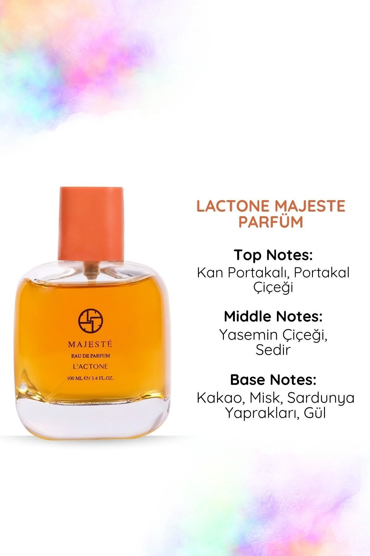 L'ACTONE 100ML Parfüm Majeste, zarif ve etkileyici bir koku profili sunar.; Üst notalarda kan portakalı ve portakal çiçeği, canlı ve taze bir başlangıç sağlar.; Orta notalarda yasemin çiçeği ve sedir, parfüme çiçeksi ve odunsu bir derinlik katar.; Alt notalarda kakao, misk, sardunya yaprakları ve gül, parfüme zengin ve kalıcı bir kapanış getirir, tüm gün etkileyici ve sofistike bir iz bırakır.; Kullanım ve Avantajlar: Nasıl Kullanılır:Temiz ve kuru cilde, nabız noktalarına (boyun, bilek) hafifçe uygulayın.; Gün boyunca kalıcılığını artırmak için ihtiyaç duydukça yeniden uygulayabilirsiniz.; ; Canlı ve Taze Açılış:Kan portakalı ve portakal çiçeğinin ferah ve canlı açılışı, enerji verici ve taze bir koku deneyimi sunar.; ; Çiçeksi ve Odunsu Orta Notalar:Yasemin çiçeği ve sedirin birleşimi, parfüme sofistike bir çiçeksi ve odunsu derinlik katar.; ; Zengin ve Kalıcı Kapanış:Kakao, misk, sardunya yaprakları ve gülün birleşimi, derin ve kalıcı bir iz bırakır, gün boyunca etkileyici bir parfüm deneyimi sunar.; ; Şık Şişe Tasarımı:Modern ve zarif şişe tasarımı, parfümü estetik ve kullanışlı kılar, kişisel bakım rutininizin vazgeçilmezi olur.; ; Özel Anlar İçin:Majeste, özel anlar ve etkinlikler için mükemmel bir seçimdir, kendinizi ve çevrenizi etkileyici bir koku ile sarar.; ; Kan portakalı ve portakal çiçeğinin canlı açılışı, yasemin çiçeği ve sedirin çiçeksi ve odunsu derinliğiyle birleşir.; Kakao, misk, sardunya yaprakları ve gülün zengin kapanışı, kalıcı ve etkileyici bir parfüm deneyimi sunar.