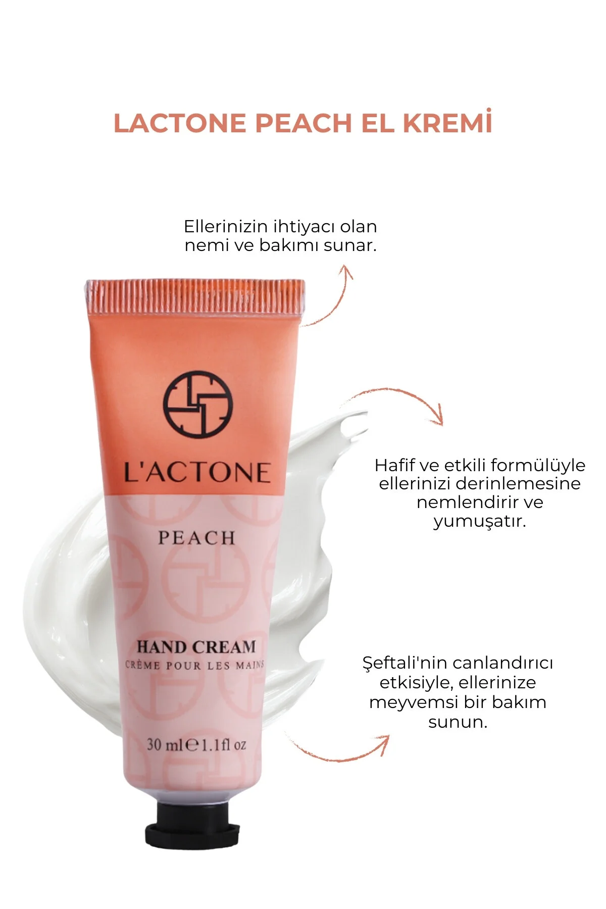 LACTONE Peach El Kremi 30 ml Tazeleyici ve canlandırıcı bir cilt bakımı deneyimi için LACTONE Peach El Kremi tam size göre! Şeftalinin hafif ve ferahlatıcı kokusuyla zenginleştirilmiş bu krem, ellerinize yoğun nem verirken yumuşak ve pürüzsüz bir doku kazandırır; ; Gün boyunca sürecek tazelik ve bakım için ideal bir seçim; ; Ürün Özellikleri:; Yoğun Nemlendirme: Şeftali özü ile zenginleştirilmiş formülü, cildinize derinlemesine nem sağlar ve kuruluk hissini giderir; ;; Hafif ve Canlandırıcı Koku: Ferah şeftali kokusu ellerinizde uzun süre kalıcıdır ve her kullanımda cildinizde taze bir his bırakır; ;; Hızla Emilen Formül: Yağlı bir his bırakmadan cilt tarafından hızla emilir, ellerinizi anında nemlendirir ve yumuşatır; ;; Tüm Cilt Tiplerine Uygun: Hassas ciltler dahil olmak üzere tüm cilt tipleri için uygun, hipoalerjenik bir formüle sahiptir; ;; Kompakt Boyut: 30 ml'lik pratik boyutu ile yanınızda kolayca taşıyabilir, ihtiyaç duyduğunuz her an kullanabilirsiniz; ; Neden LACTONE Peach El Kremi?; Taze Şeftali Kokusu: Şeftalinin doğal ferahlığıyla cildinizi şımartırken, hoş kokusuyla gün boyu tazelik hissi verir; ;; Kolay Kullanım: Hafif ve hızlı emilen yapısıyla gün içinde ellerinizi yağlandırmadan etkili bir şekilde nemlendirir; ;; Pratik Boyut: Çantanızda, ofisinizde veya seyahatlerde yanınızda taşıyabileceğiniz bu krem, her an cildinize bakım yapma fırsatı sunar; ; LACTONE Peach El Kremi, ferah şeftali kokusuyla ellerinizi hem besler hem de cildinizde tatlı ve taze bir his bırakır; ; Ellerinizde şeftali yumuşaklığı ve zarif kokusunu hissetmek için bu el kremini her an yanınızda bulundurun!