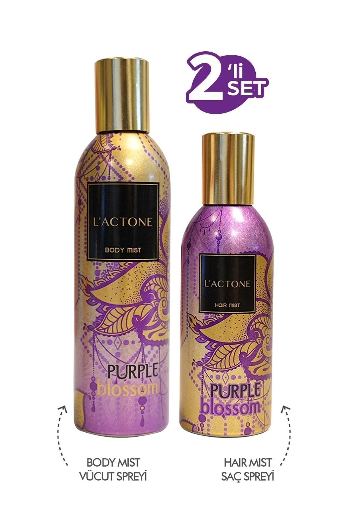 Purple Blossom Body Mist & Hair Mist 2'li Set, hem vücudunuz hem de saçlarınız için mükemmel bir koku deneyimi sunuyor.; Purple Blossom'un çiçeksi ve taze kokusuyla gün boyu kendinizi enerjik ve ferah hissedin.; Bu set, sizi baştan ayağa saran bir koku bulutu oluşturur ve her anınıza zarafet katar.; Set İçeriği: Body Mist (Vücut Spreyi):Tüm vücuda uygulanabilir, hafif yapısıyla gün boyu taze bir koku sunar.; ; Hair Mist (Saç Spreyi):Saçlara canlılık ve ferahlık kazandırır, her hareketinizde hoş bir koku yaymanıza yardımcı olur.; ; Kullanım Önerisi: Body Mist:Duş sonrası temiz cildinize uygulayın veya gün içinde tazelemek için istediğiniz zaman kullanın.; Vücudunuzun her yerine rahatlıkla sıkabilirsiniz.; ; Hair Mist:Saçlarınıza 15-20 cm mesafeden sıkın.; İsterseniz tarak yardımıyla kokunun saçınıza eşit dağılmasını sağlayabilirsiniz.; ; Avantajları: Taze ve Çiçeksi Koku:Purple Blossom’un etkileyici kokusuyla her anınızda ferah ve çekici hissedin.; ; Uzun Süre Kalıcı:Hem vücut hem de saç spreyi, kokusunu uzun süre muhafaza eder.; ; Pratik ve Kullanışlı:Çantanızda kolayca taşıyabileceğiniz bu set, her an taze bir kokuya sahip olmanızı sağlar.