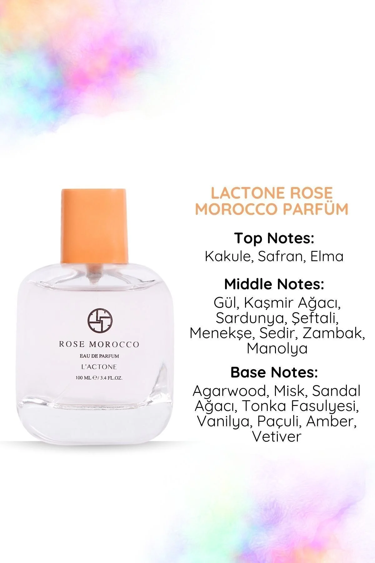 L'ACTONE 100ML Parfüm Rose Morocco, büyüleyici ve egzotik bir parfüm deneyimi sunar. Üst notalarda kakule, safran ve elmanın taze ve baharatlı birleşimi, enerjik bir açılış sağlar. Orta notalarda gül, kaşmir ağacı, sardunya, şeftali, menekşe, sedir, zambak ve manolyanın zengin ve çiçeksi harmanı, parfüme derinlik ve zarafet katar. Alt notalarda agarwood, misk, sandal ağacı, tonka fasulyesi, vanilya, paçuli, amber ve vetiver'in karmaşık ve kalıcı birleşimi, etkileyici bir kapanış sağlar. Kullanım ve Avantajlar: Nasıl Kullanılır:Temiz ve kuru cilde, nabız noktalarına (boyun, bilek) hafifçe uygulayın. Gün boyunca etkisini artırmak için ihtiyaç duydukça yeniden uygulayabilirsiniz. ; Egzotik Üst Notalar:Kakule, safran ve elmanın taze ve baharatlı birleşimi, enerjik ve canlı bir başlangıç sunar. ; Zengin Çiçeksi Orta Notalar:Gül, kaşmir ağacı, sardunya, şeftali, menekşe, sedir, zambak ve manolyanın harmanı, derinlik ve zarafet katarak parfümün karakterini belirler. ; Kalıcı ve Karmaşık Alt Notalar:Agarwood, misk, sandal ağacı, tonka fasulyesi, vanilya, paçuli, amber ve vetiver'in uyumlu birleşimi, etkileyici ve uzun süre kalıcı bir kapanış sağlar. ; Şık Şişe Tasarımı:Modern ve zarif şişe tasarımı, parfümü kişisel bakım koleksiyonunuzun estetik bir parçası yapar. ; Günlük ve Özel Anlar İçin:Rose Morocco, hem günlük kullanım hem de özel etkinlikler için mükemmel bir tercihtir, kendinizi ve çevrenizi egzotik ve zarif bir koku ile sarmalar. ; Rose Morocco, egzotik ve zarif notalarıyla sofistike bir parfüm deneyimi sunar, her anınızı özel kılar.