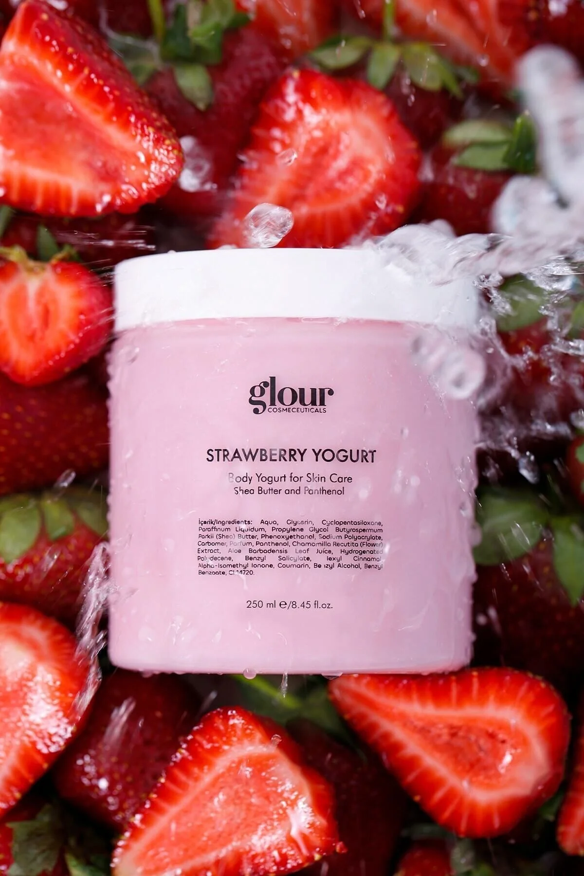 Her bir damlası taze çileklerin tatlılığını ve yoğurdun ferahlığını yansıtan GLOUR Strawberry Yogurt, cildinizi derinlemesine nemlendirirken adeta bir tedavi sağlar.;Yoğun nemlendirici özellikleriyle cildinizi besler ve yumuşaklıkla dolu bir dokunuş sağlar.; Strawberry Yogurt, doğal özleriyle cildinizi canlandırırken aynı zamanda pürüzsüzleştirir ve cilt tonunu dengeler.; Cildinizin parlaklığını ortaya çıkarırken, aynı zamanda lekelerin görünümünü azaltır ve cildinizin doğal güzelliğini ön plana çıkarır.; Bu harika ürün, kolay emilen hafif formülü sayesinde cildinizde hızla etki gösterir.; GLOUR Strawberry Yogurt'u düzenli olarak kullanarak cildinizdeki farkı gözlemlemeye başlayacaksınız.;İpeksi bir dokunuşla cildinizin yumuşacık olmasına ve canlanmasına şahit olacaksınız.; GLOUR markası olarak, ürünlerimizi en kaliteli ve doğal içeriklerle formüle ediyoruz.; GLOUR Strawberry Yogurt da bu prensiple üretilmiştir.;Doğal özlerle zenginleştirilmiş, paraben ve sülfat içermeyen formülü ile cildinizi rahatlatırken, hassas ciltlere de uyum sağlar.