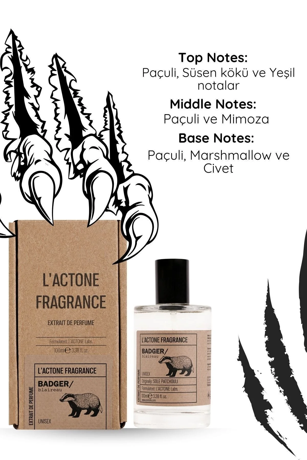 Üst Notalar: Paçuli süsen kökü ve yeşil notalar Orta Notalar: Paçuli mimoza Temel Notalar: Paçuli marshmallow ve civet Doğanın gizemli ve etkileyici tarafını yansıtan LACTONE 100ML Parfüm bal porsuğu, cesur ve sofistike bir koku deneyimi sunuyor.; Üstnotalarda paçuli, süsen kökü ve yeşil notaların birleşimi, ferah ve doğayla içiçe bir başlangıç sağlar.; Orta notalarda paçuli ve mimozanın zarif dokunuşları,parfüme derinlik ve sofistike bir karakter kazandırır.; Temel notalarda paçuli,marshmallow ve civetin tatlı ve odunsu birleşimi, uzun süre etkileyici vekalıcı bir iz bırakır.; LACTONE Kunduz, etkileyici ve lüks bir koku arayanlariçin mükemmel bir tercihtir.; Kullanım ve Avantajlar: Nasıl Kullanılır:Temiz ve kuru cilde, özellikle nabız noktalarına (boyun, bilek, kulak arkası) 15-20 cm mesafeden sıkılarak uygulanır.; Gün içinde ihtiyaç duyduğunuzda tekrarlanabilir.; ; Gün Boyu Kalıcılık:Zengin ve çok katmanlı koku profili sayesinde, uzun süre etkisini kaybetmeden tazelik sağlar.; ; Her Ortama Uygun:Hem günlük kullanıma hem de özel anlara uygun, dikkat çekici ve zarif bir parfüm.; ; Ciltle Dost Formül:Hassas ciltlere uygun, tahrişe neden olmayan yumuşak formül.; ; Zengin ve Derin Koku Deneyimi:Zamanla değişen katmanlar sayesinde her kullanımda yeni bir koku deneyimi sunar.; ; Şık ve Modern Tasarım:Zarif şişe tasarımı ile hem estetik bir görüntü sağlar hem de seyahatlerinizde kolayca taşınabilir.; ; LACTONE Badger ile doğanın zarafetini ve sofistikasyonunuyanınızda taşıyın!
