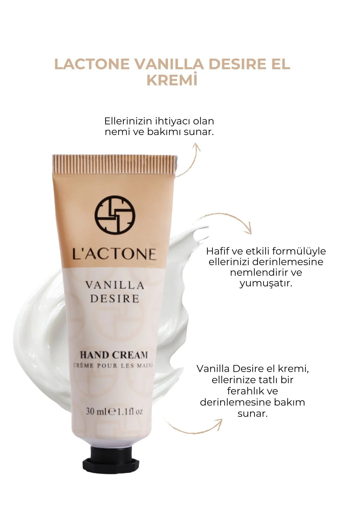 LACTONE Vanilla Desire El Kremi 30 ml Ellerinize zarif bir dokunuş kazandırmak için LACTONE Vanilla Desire El Kremi ile tanışın! Vanilyanın yumuşak ve baştan çıkarıcı kokusuyla harmanlanmış bu krem, cildinize derinlemesine bakım yaparak ellerinizi nemlendirir ve yumuşacık bir doku sağlar; ; Her kullanımdan sonra ellerinizde bırakacağı uzun süreli vanilya aroması ile cilt bakımınıza lüks bir dokunuş katın; ; Ürün Özellikleri:; Yoğun Nemlendirme: Vanilya özü ile zenginleştirilen formülü, cildi derinlemesine nemlendirir, kuruluğu önler ve yumuşatır; ;; Hoş Vanilya Kokusu: Sıcak ve çekici vanilya kokusu, ellerinizde kalıcı bir koku bırakır ve her kullanışta taze bir his verir; ;; Kolay Emilen Doku: Hafif yapısı sayesinde hızla emilir, cildinizde yağlı bir his bırakmaz ve gün boyu ferahlık sağlar; ;; Tüm Cilt Tiplerine Uygun: Hipoalerjenik formülü, hassas ciltler de dahil olmak üzere tüm cilt tipleri için güvenle kullanılabilir; ;; Pratik Boyut: 30 ml’lik kompakt boyutuyla her an yanınızda taşıyabileceğiniz bu krem, ellerinizi gün boyu nemli ve pürüzsüz tutar; ; Neden LACTONE Vanilla Desire El Kremi?; Rahatlatıcı Vanilya Deneyimi: Vanilyanın doğal yumuşatıcı etkisi ve ciltte bıraktığı hoş kokusuyla gün boyu ferah ve taze eller; ;; Cildinizi Şımartın: Doğal içeriklerle zenginleştirilmiş bu krem, ellerinizin nem dengesini korur ve cildinizi yumuşacık yapar; ;; Kompakt ve Pratik: Çantanızda, cebinizde veya ofisinizde her an kullanabileceğiniz bu krem, ellerinizi her daim bakımlı tutmanıza yardımcı olur; ; LACTONE Vanilla Desire El Kremi, ellerinizi nemlendirmekle kalmaz, aynı zamanda sıcak ve baştan çıkarıcı vanilya kokusuyla cildinizde kalıcı bir zarafet bırakır; ; Her uygulamada kendinizi özel hissetmek ve ellerinizi şımartmak için bu kremi yanınızdan ayırmayın!